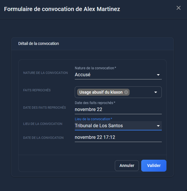 Il faudra alors remplir les informations (Pas de récidive sur les convocations) la convocations doit être minimum 48h plus tard